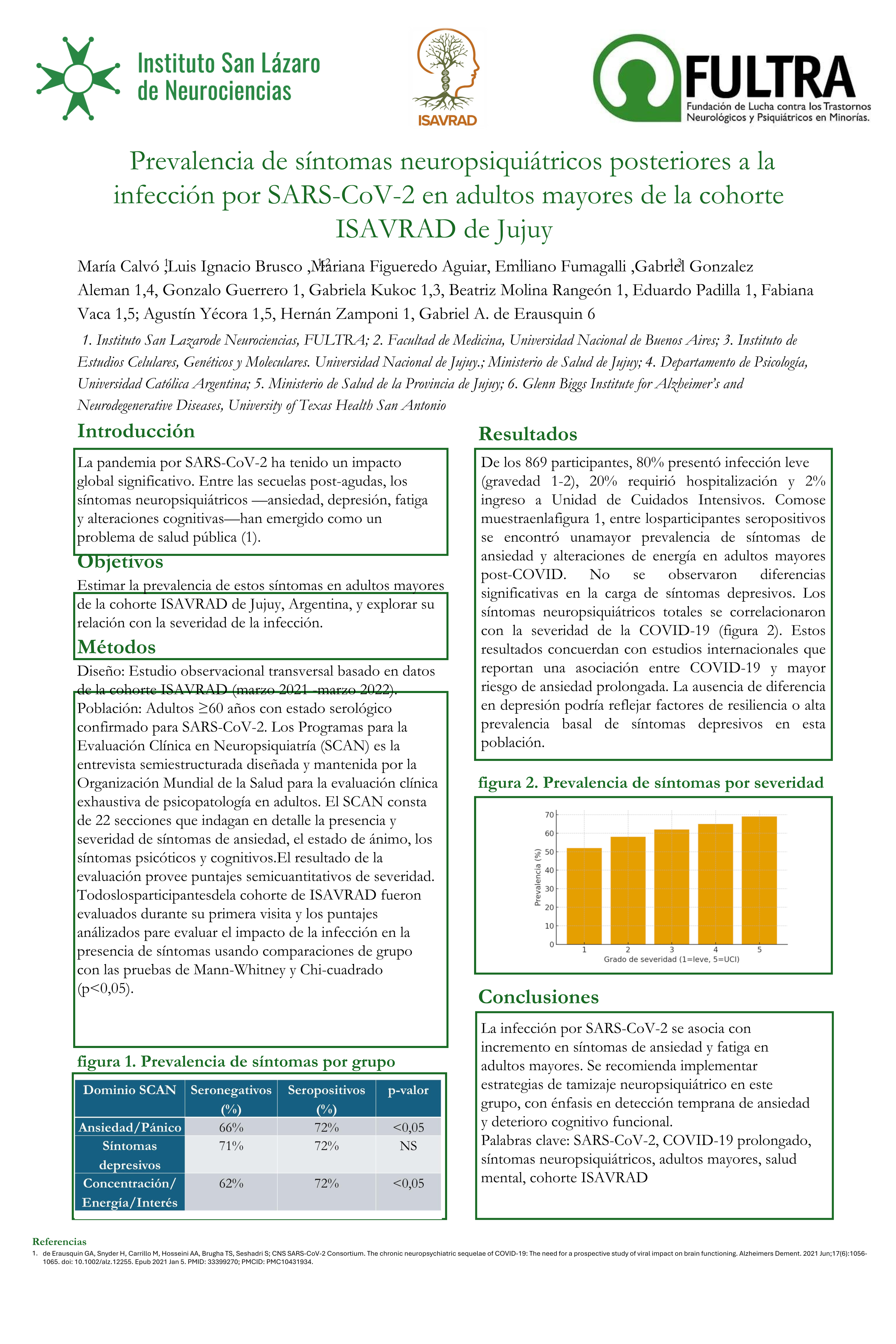 | Prevalencia de síntomas neuropsiquiátricos posteriores a la infección por SARS-CoV-2 en adultos mayores de la cohorte ISAVRAD de Jujuy | María Calvo (Erausquin) |