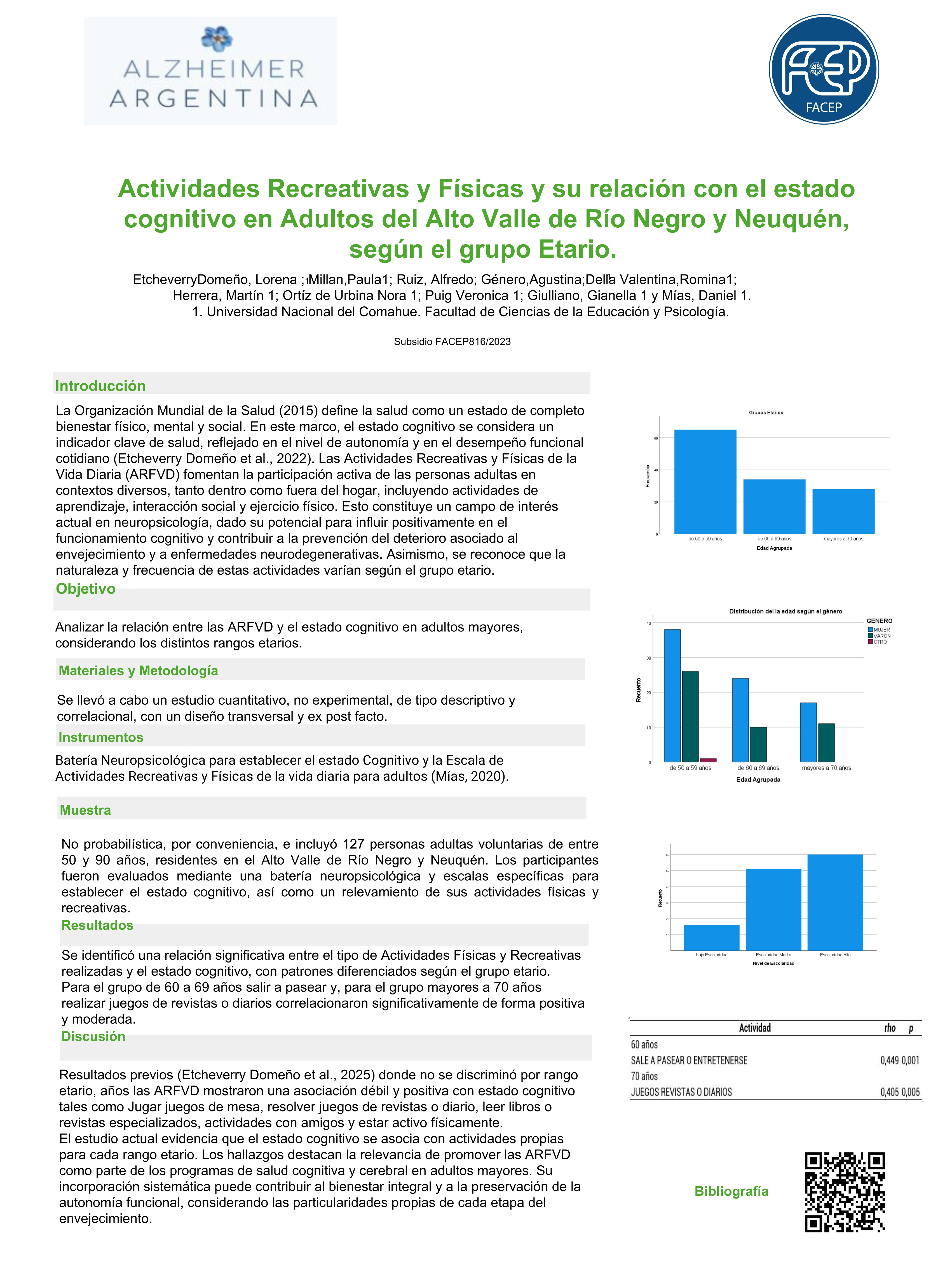 | Actividades Recreativas y Físicas y su relación con el estado cognitivo en Adultos del Alto Valle de Río Negro y Neuquén, según el grupo Etario | Lorena Etcheverry Domeño |