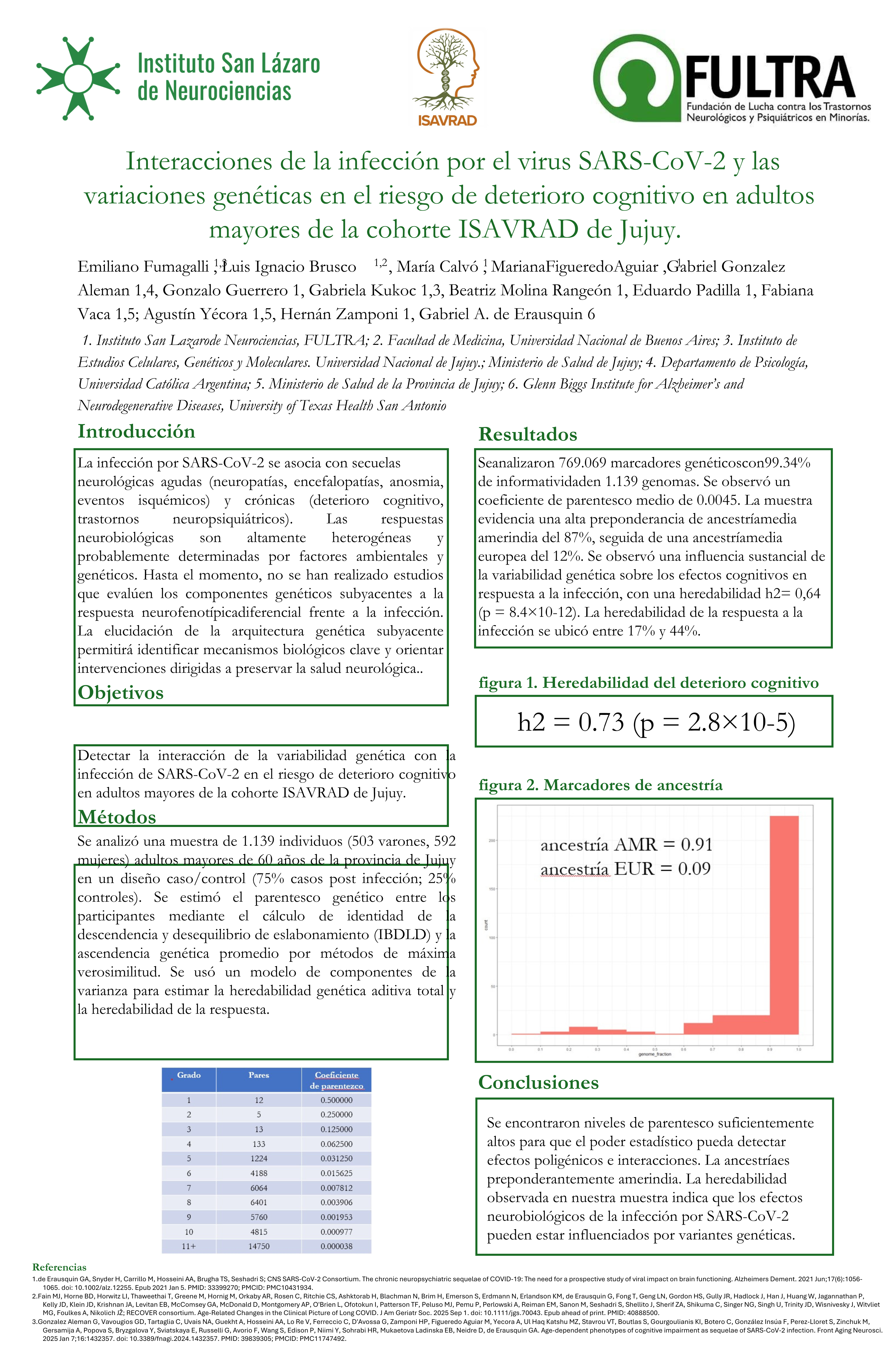 | Interacciones de la infección por el virus SARS-CoV-2 y las variaciones genéticas en el riesgo de deterioro cognitivo en adultos mayores de la cohorte ISAVRAD de Jujuy | Emiliano Fumagalli (Erausquin) |