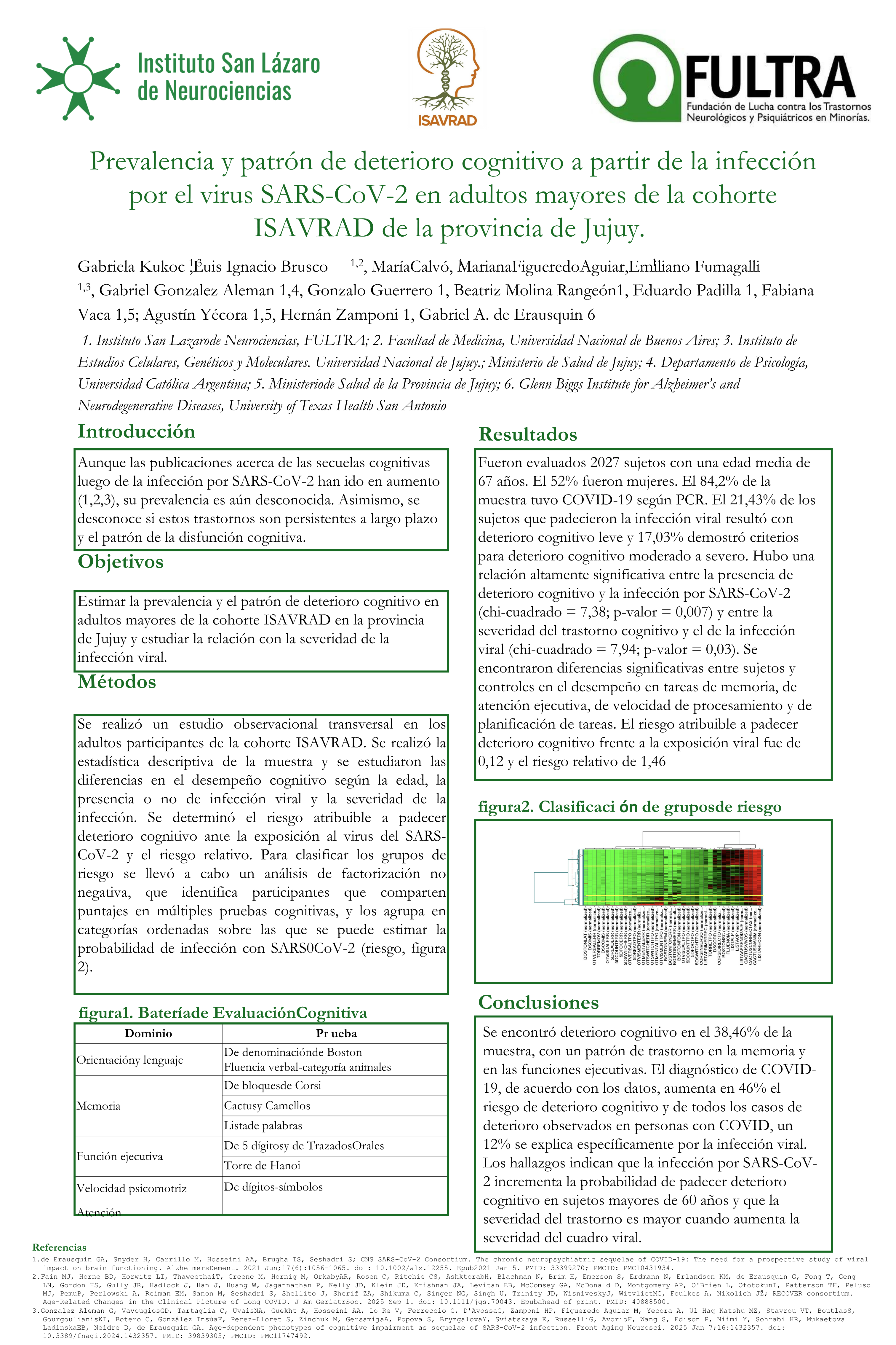 | Prevalencia y patrón de deterioro cognitivo a partir de la infección por el virus SARS-CoV-2 en adultos mayores de la cohorte ISAVRAD de la provincia de Jujuy | Gabriela Kukoc (Erausquin) |